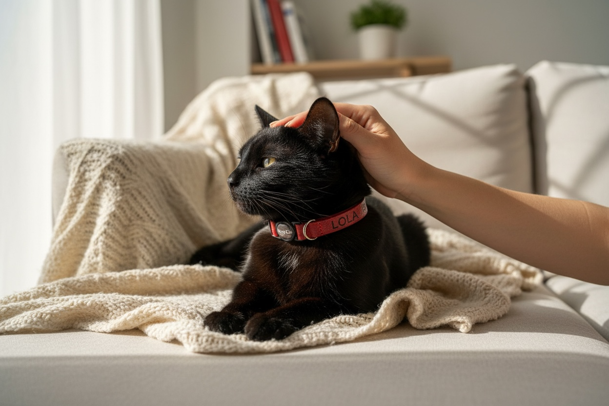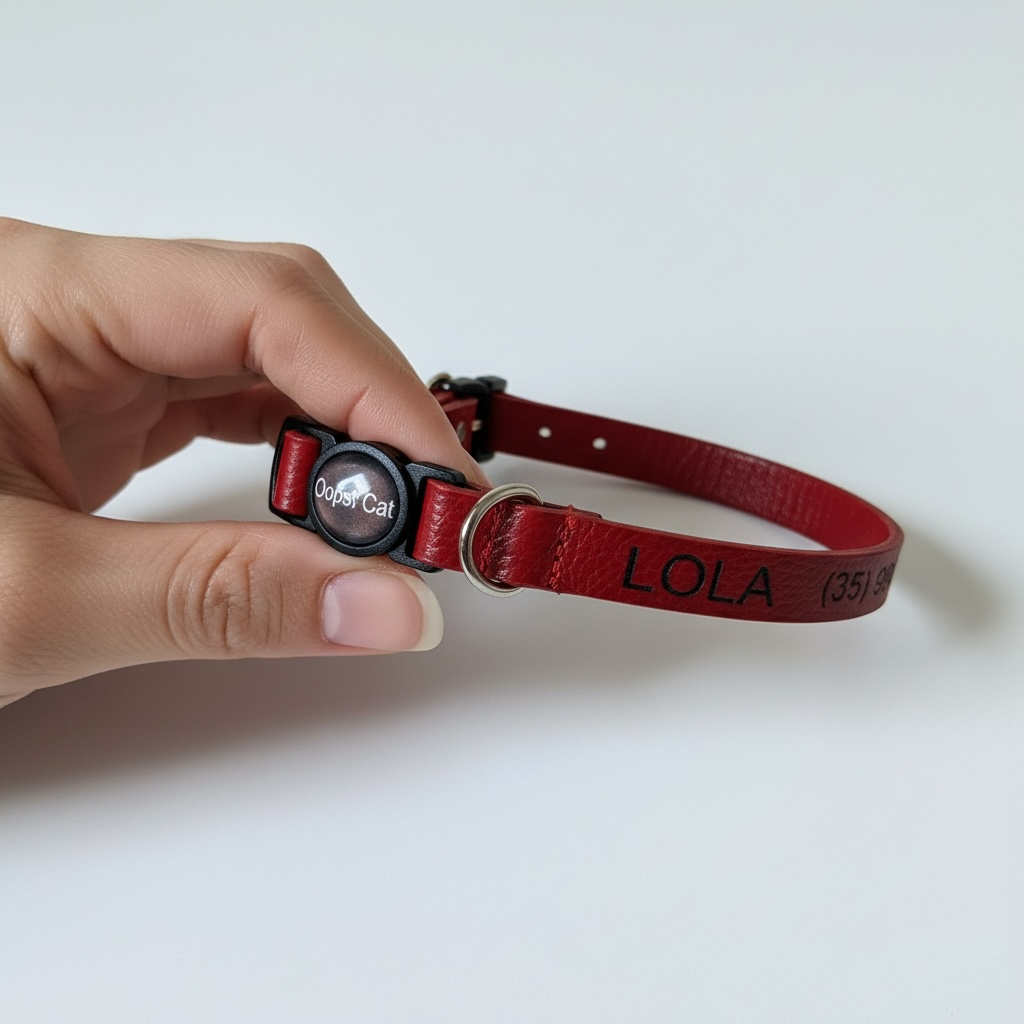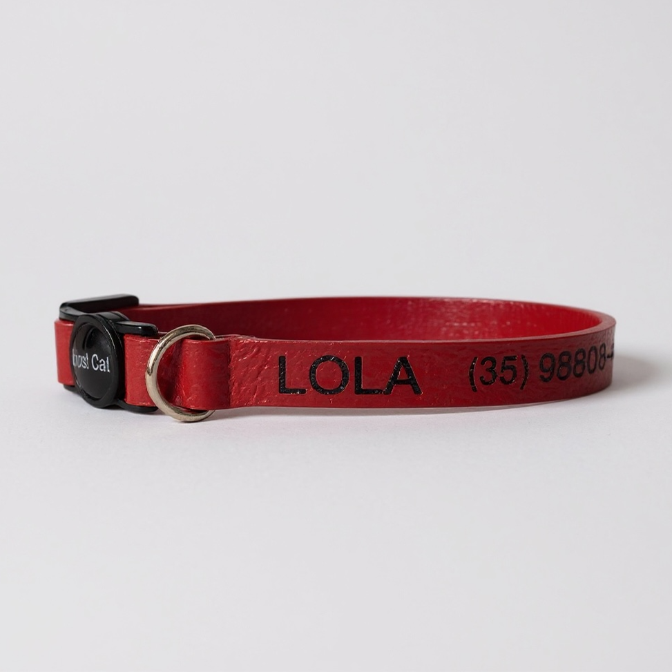 Coleira de gato em couro legítimo, personalizada com gravação a laser do nome e telefone. Elegante, resistente e confortável, garante estilo e segurança para o seu pet no dia a dia.