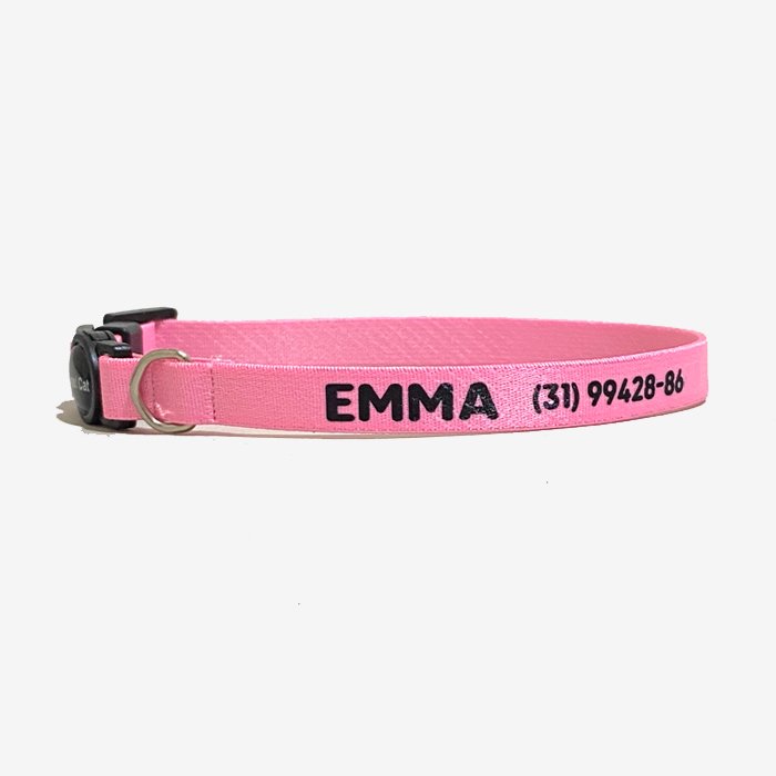Coleira de gato com identificação, fecho breakaway anti enforcamento.